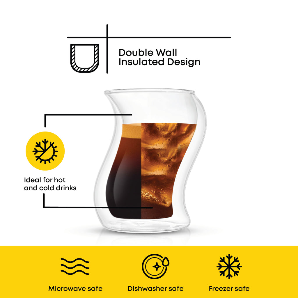 Espresso excellence in every sip! Crafted from premium borosilicate glass, these double-walled glass cups keep your espresso luxuriously hot, highlighting the rich aroma and bold flavor. The clever design feels light in your hand, and the stackable form (thanks to the unique grooves!) saves precious cabinet space. Enjoy pure espresso perfection, from the first invigorating pull to the last delightful drop.