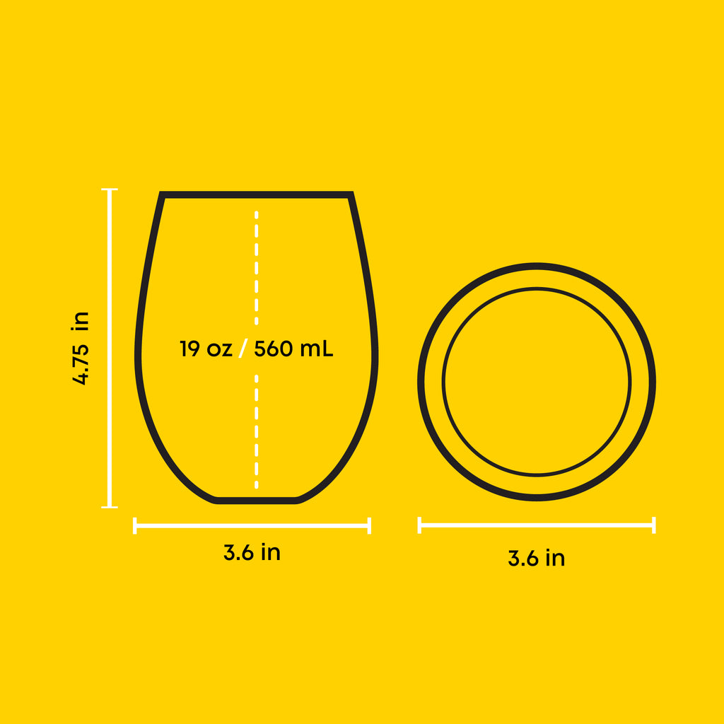 - Curved, comfortable-to-grip stemless shape with a weighted base (no wobbles!)